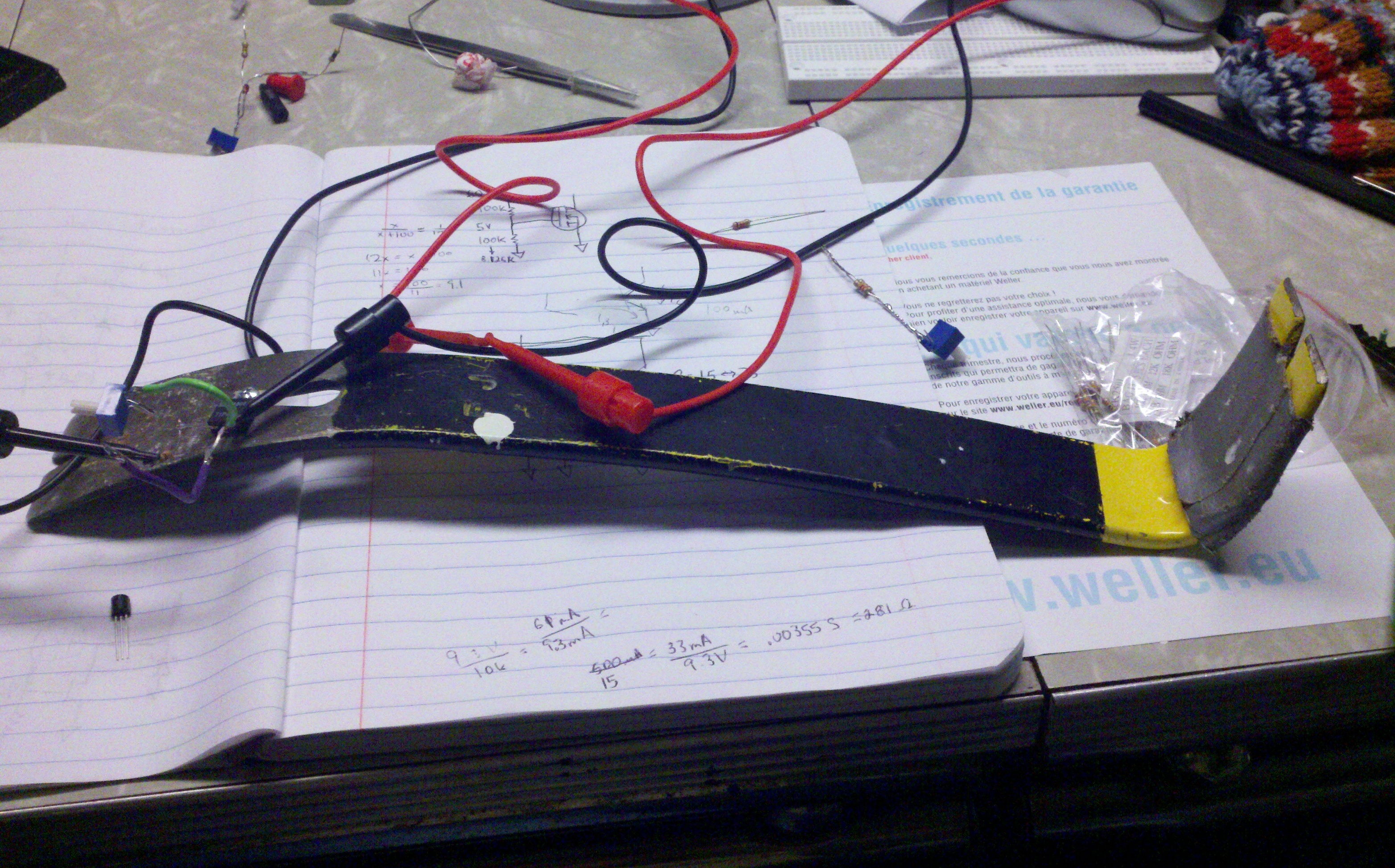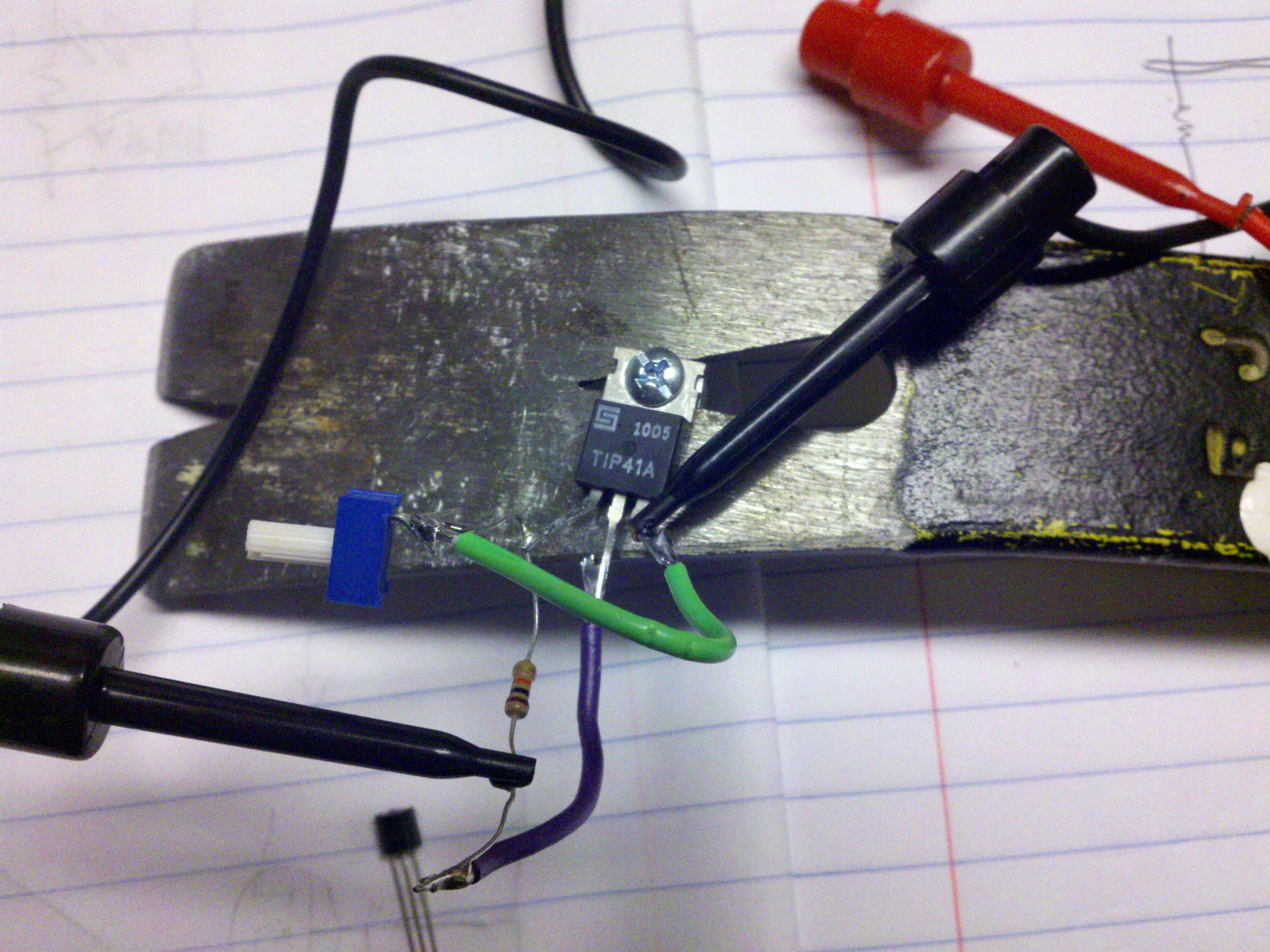 In this circuit, the divider from the incoming source (the top rail) sets the current going to the base ($$i_{B}$$) and this times the $$beta$$ (in this case anywhere from 15-60) equals the current down through the collector ($$i_{C}$$). This is not the optimal way to sink current from your source, but it’s a start. The fact that I’m dialing in the current with a potentiometer in a divider that is also connected to the incoming load is not great, but again, this was a quick and dirty way to get up and running. But wait, you think that’s a makeshift circuit? Check out my heatsink: