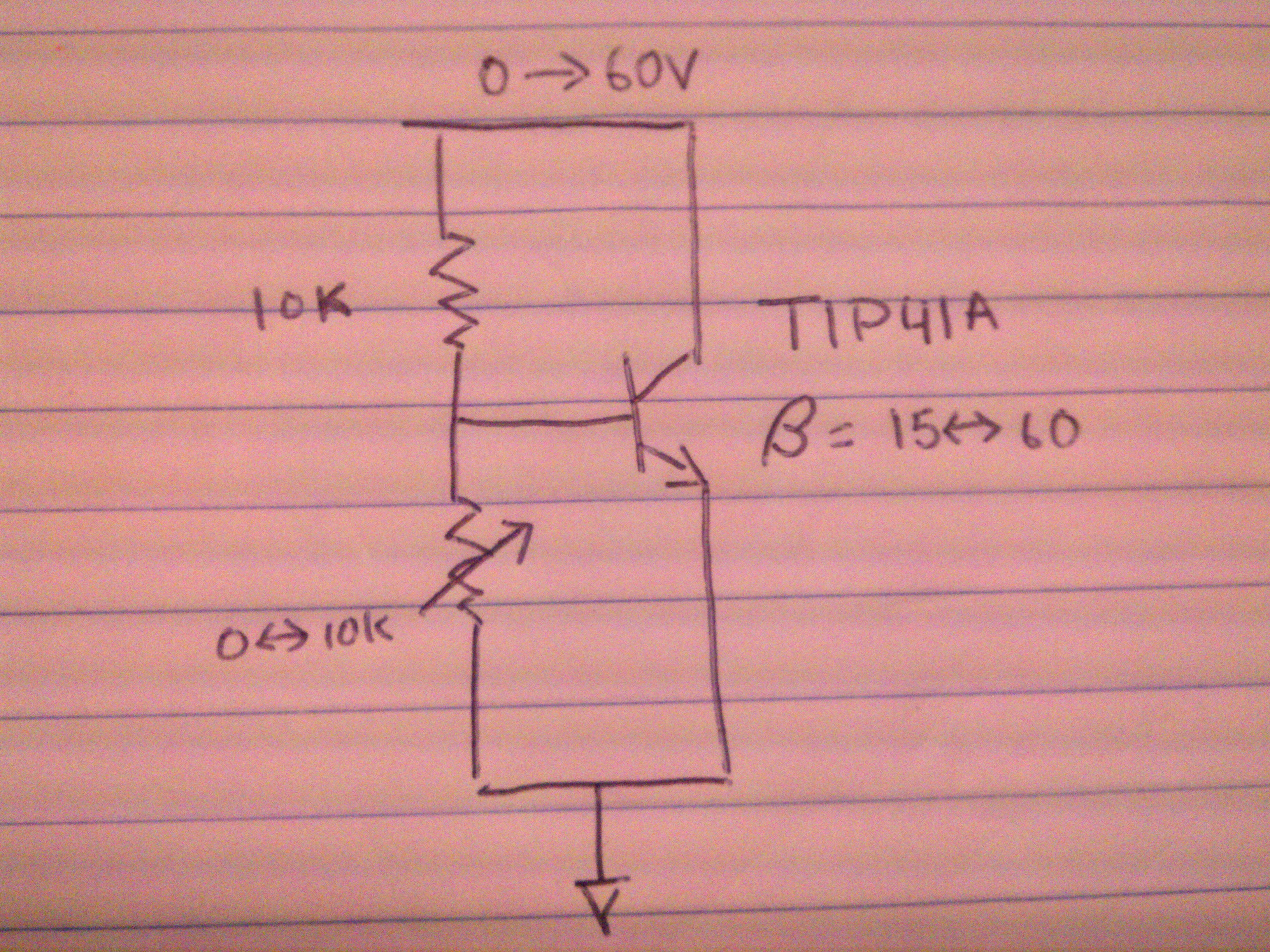 This is quite a bit of power. I was using the TIP41A that I have on hand, a power NPN transistor in a TO-220 package. With this amount of power, a heatsink is most definitely required. Here’s the simple circuit: